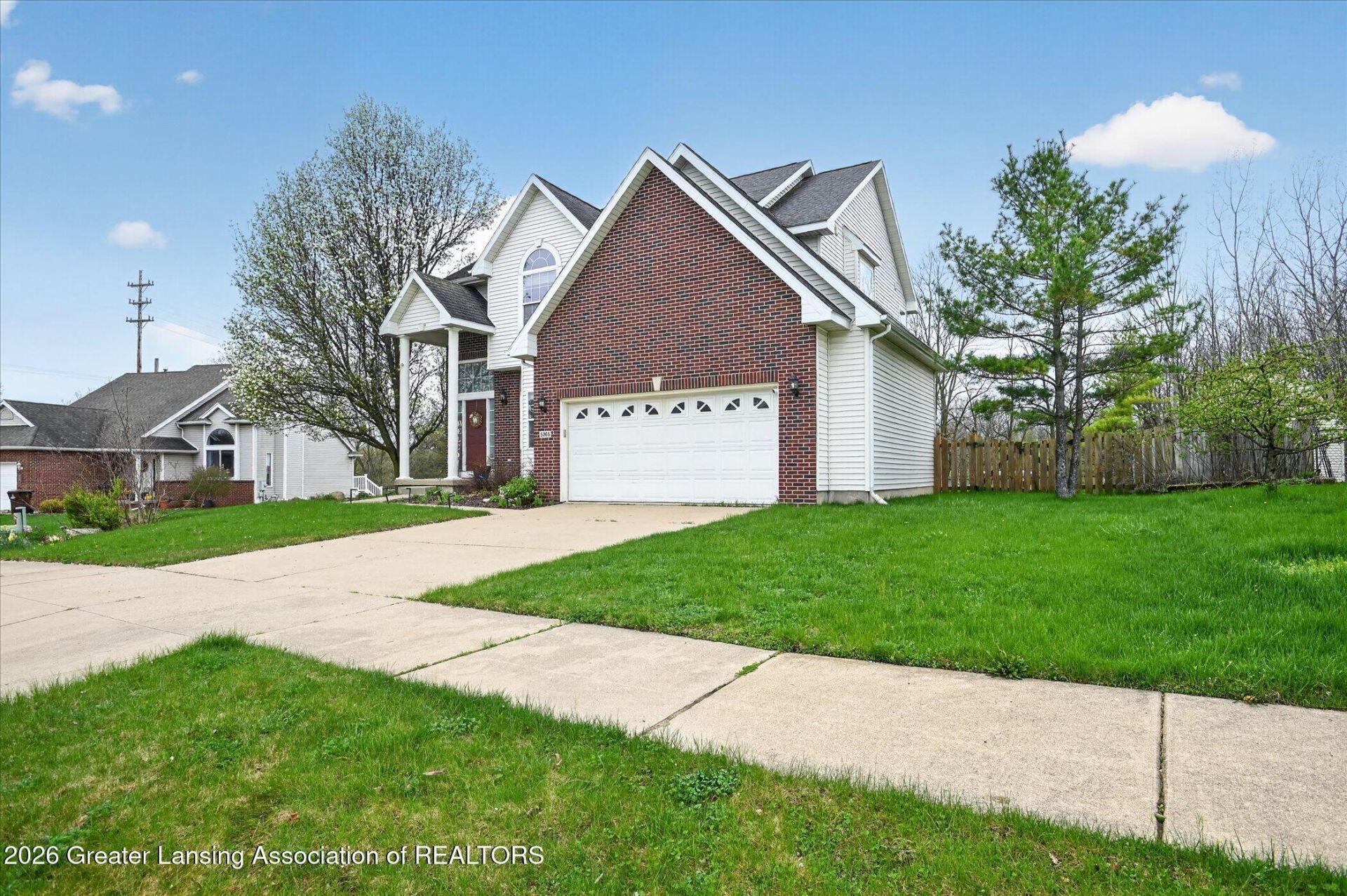 Contemporary 4 bed, 2.5 bath home in a desirable subdivision, ideally located near shopping and top rated Haslett schools. A striking two-story foyer welcomes you inside, flanked by a versatile front flex room perfect for a living or dining space. Bay windows and abundant natural light create a warm, inviting atmosphere throughout. The spacious family room is anchored by a stone fireplace and large picture window. The kitchen is beautifully updated with new appliances, quartz countertops, and a sleek modern design. The other side of the fireplace is featured in the kitchen creating a hearth space in the large dining area. Main floor powder room and laundry complete the first floor. Upstairs, the bright and expansive primary suite offers walk-in closet, and private en suite bath complete with double sinks and a jacuzzi tub. Three more generously sized bedrooms, a hall bath, and ample closet space complete the upper level. The unfinished lower level includes daylight windows, providing excellent potential for future finished living space.